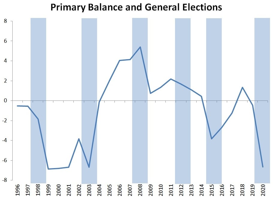 “There are also signals that the lack of fiscal discipline could be linked to political cycles. … In fact, the three years when the government’s budget balance reached its low-point before reverting towards balance (1984, 1993, and 2003) were election years”—Hausman and Klinger (2007, p. 13).